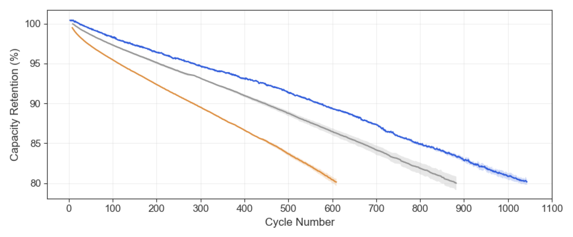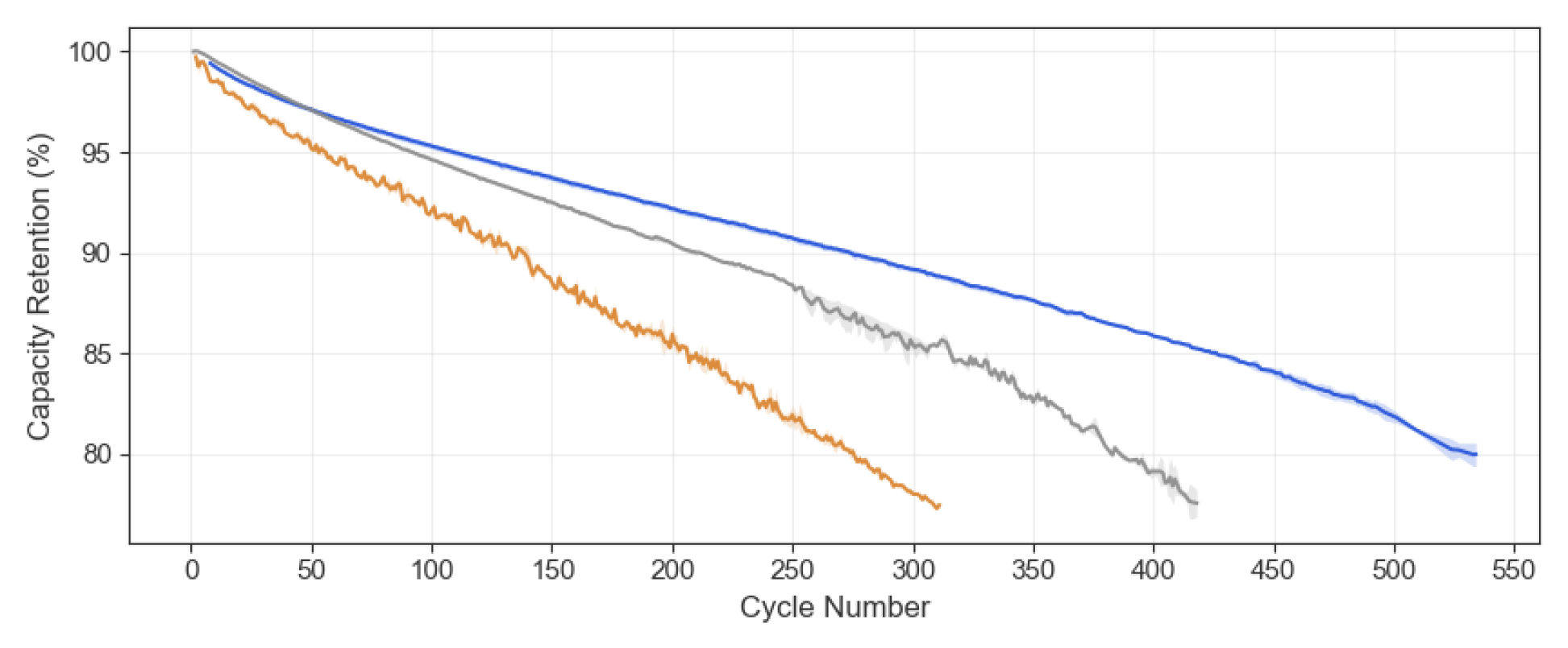 三種無極耳電池在 10A 快充條件下的容量保持率隨循環次數變化。高容量矽碳負極在快充工況下更為穩定,可維持 80% 容量保持率至約 1000+ 循環,能延長電池實際可用壽命,對需要頻繁快充的應用更具價值。