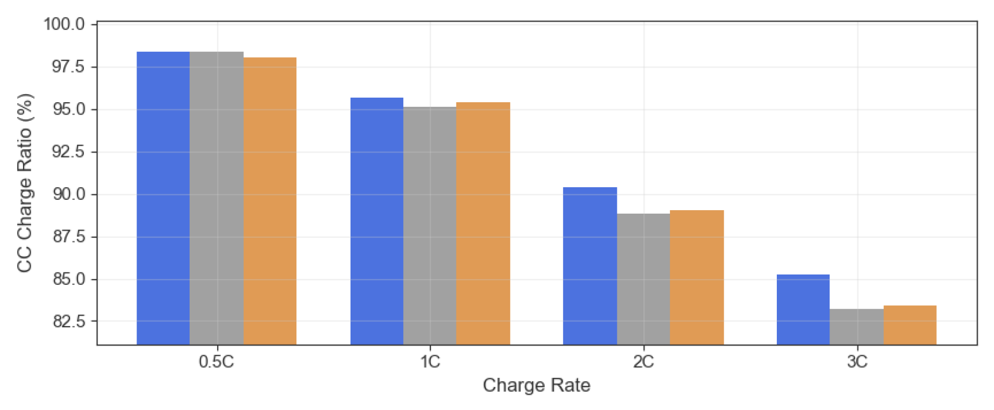 恆流段佔比愈大、充電時間愈短。在 3C 充電下,高容量矽碳負極在高倍率充電時極化較小,能維持較長恆流段,縮短總充電時間,其恆流比例 > 85%,競品矽碳負極與預鋰化矽氧負極約 83%。