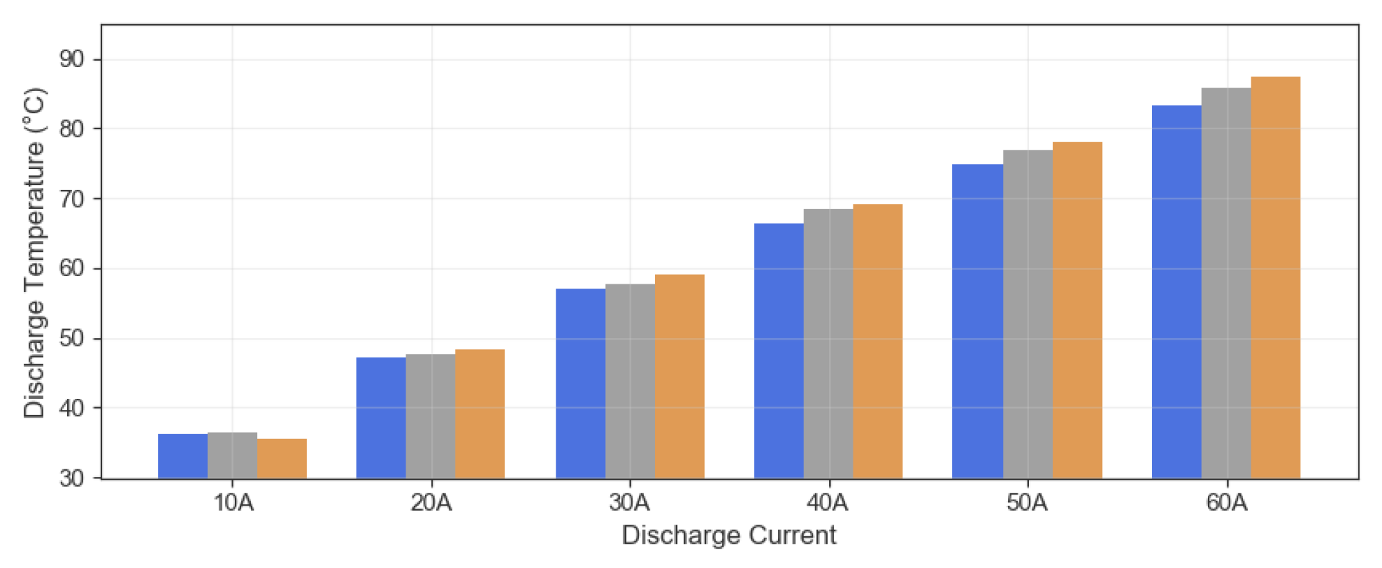 放電溫度低代表內阻與極化較小、熱管理負擔輕;在各電流下高容量矽碳負極溫升較小,可延長壽命、降低冷卻需求,對高功率應用與緊湊型電池模組尤其重要。