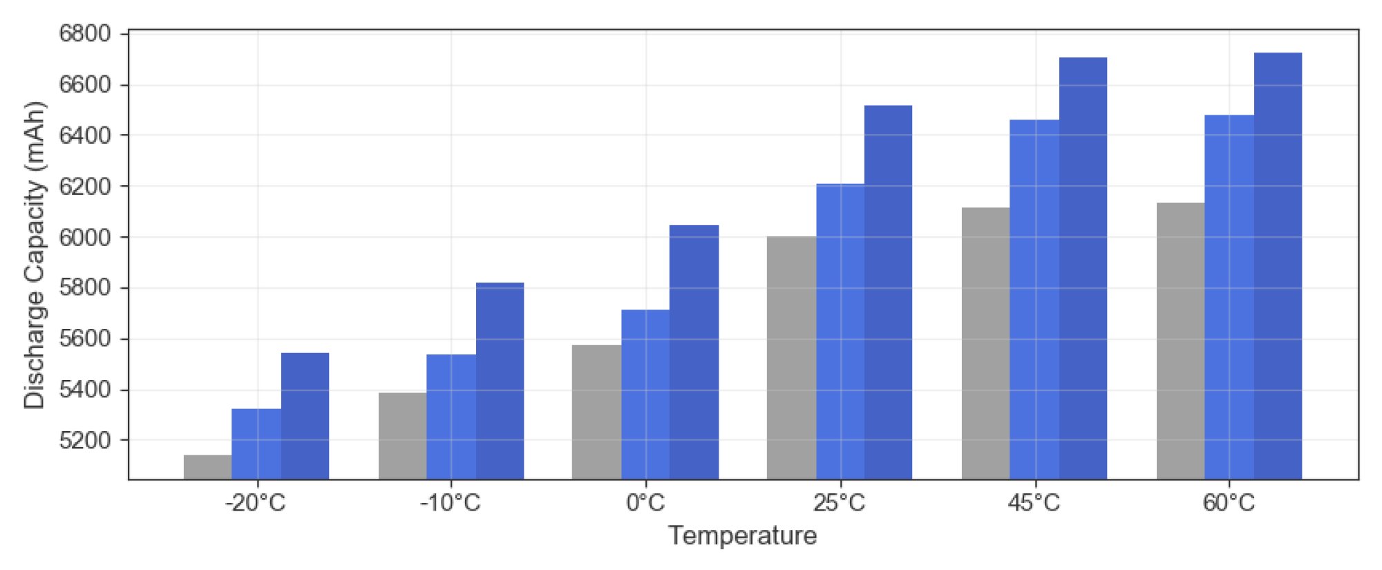 三種矽碳負極電池不同溫度(-20°C ~ 60°C)下的放電容量比較。每組依序為:競品矽碳負極 15%(灰)、高容量矽碳負極 15%(藍)、高容量矽碳負極 25%(深藍)。