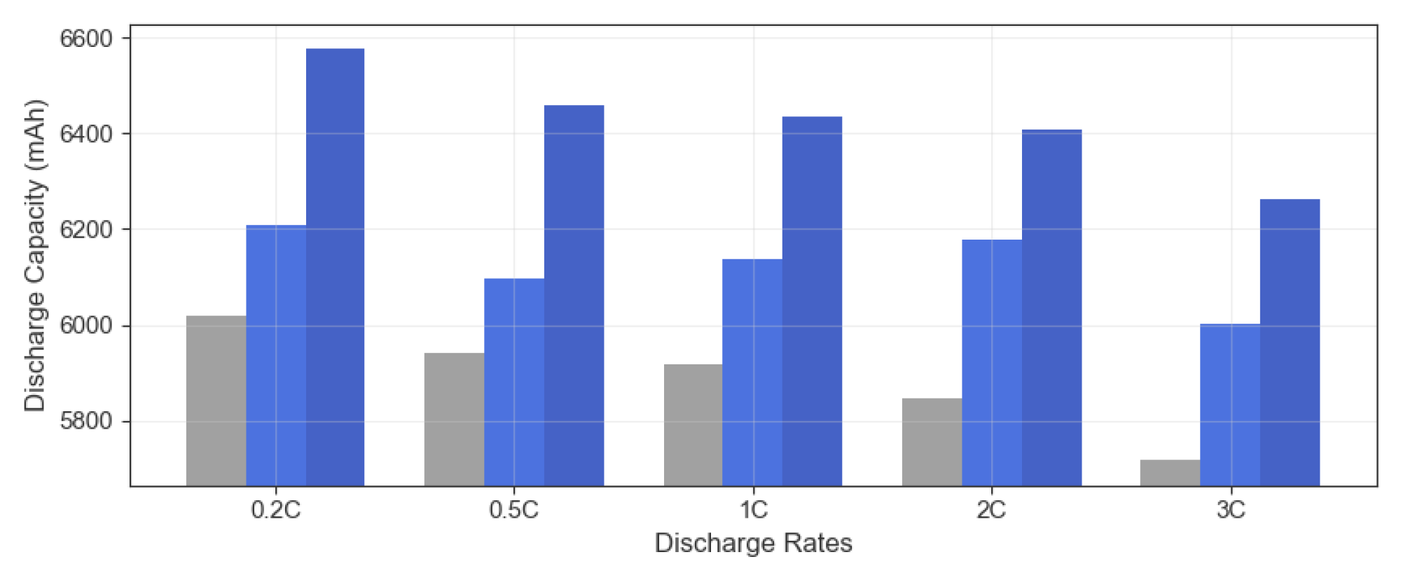 三種矽碳負極電池不同放電倍率(0.2C ~ 3C)下的放電容量比較。每組依序為:競品矽碳負極 15%(灰)、高容量矽碳負極 15%(藍)、高容量矽碳負極 25%(深藍)。